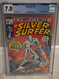 Being offered is one copy of The Silver Surfer #17 Vol. 1 from 1970 CGC graded 7.0 (Fine /Very Fine FN/VF) with off white to white pages. The CGC case is clean with no scratches or damage. This book highlights the an appearance of Mephisto, the Fantastic Four, Nick Fury and Tony Stark.